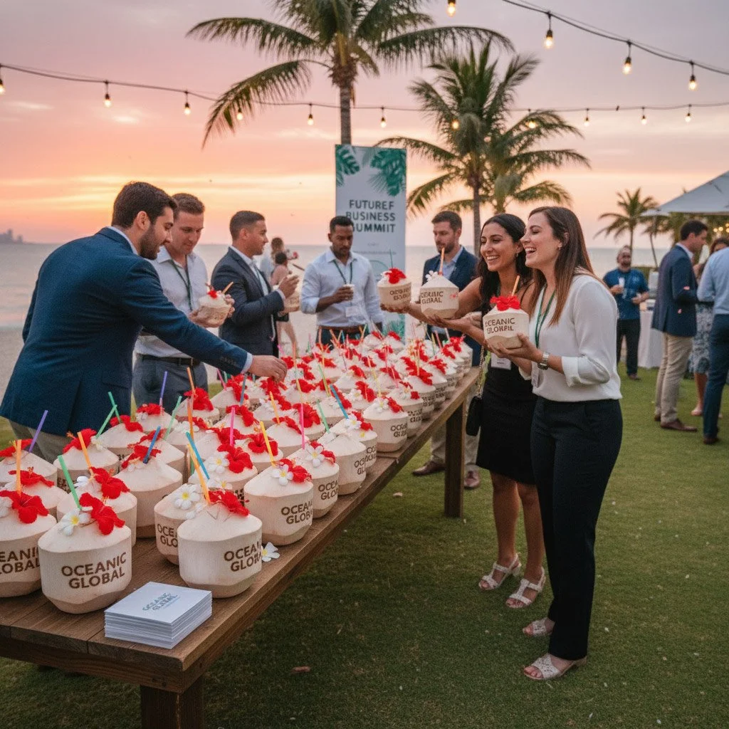 Almost any corporate event can benefit from the addition of custom-branded coconuts. Networking parties gain a lively and memorable element when guests are offered a refreshing coconut drink with the company logo. Product launches create a strong visual impact and provide a unique takeaway that reinforces brand messaging. Conferences and trade shows can use branded coconuts as attention-grabbing giveaways that attract visitors and increase engagement at booths. Client appreciation events become more thoughtful when guests receive a personalized tropical drink that reflects the company’s identity. By including these coconuts, companies can ensure that their events leave a lasting impression, blending engagement and branding seamlessly in a Miami or South Florida setting.