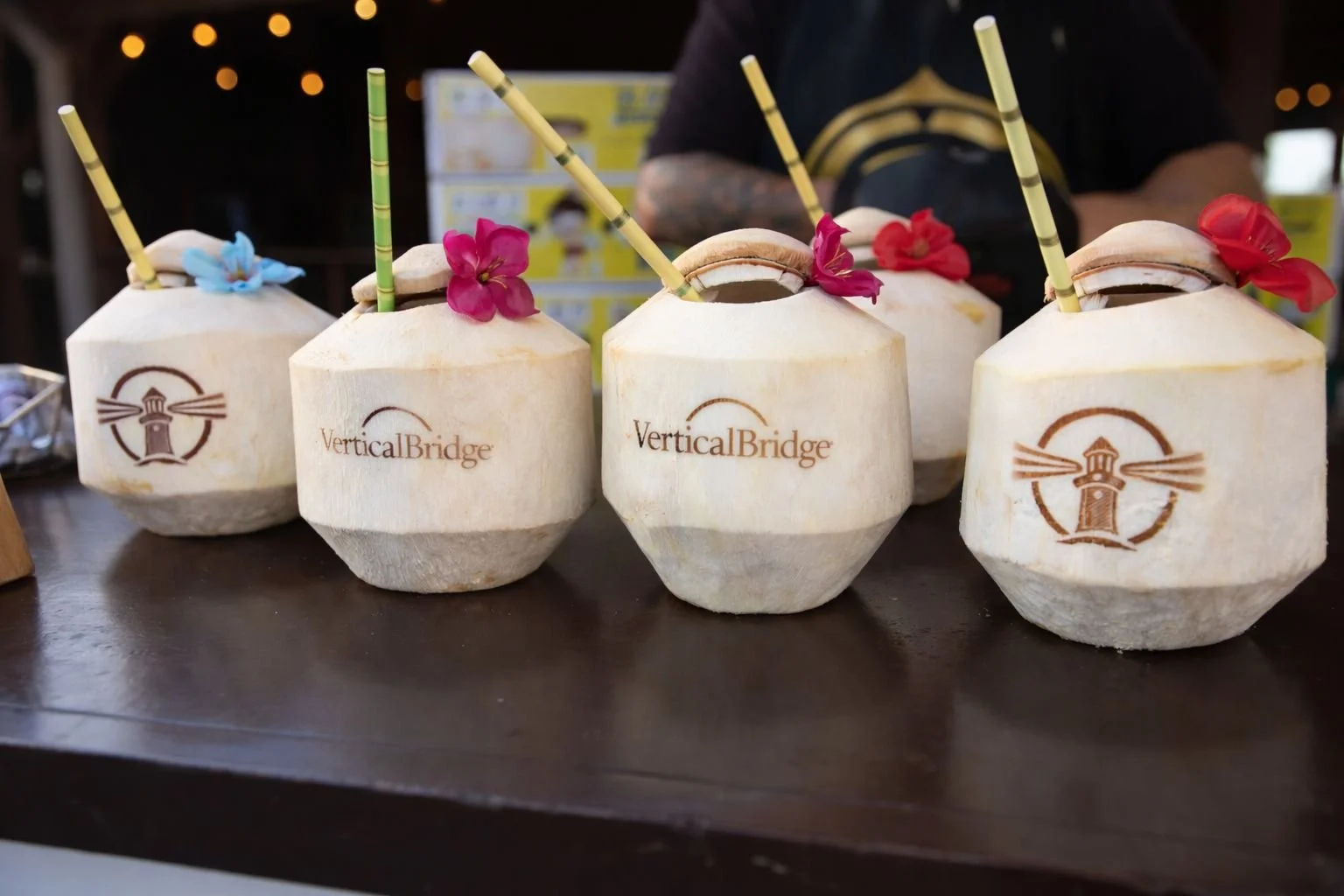 Every coconut is opened live at the event. This guarantees the water is fresh and the vessel is in perfect condition for the cocktail.